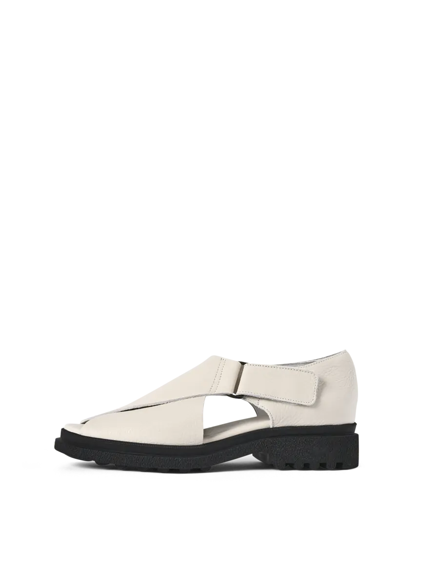 dessus : 2 brides en cuir grainé qui s’entrelaçent – boucle réglable à scratch sur le côté extérieur