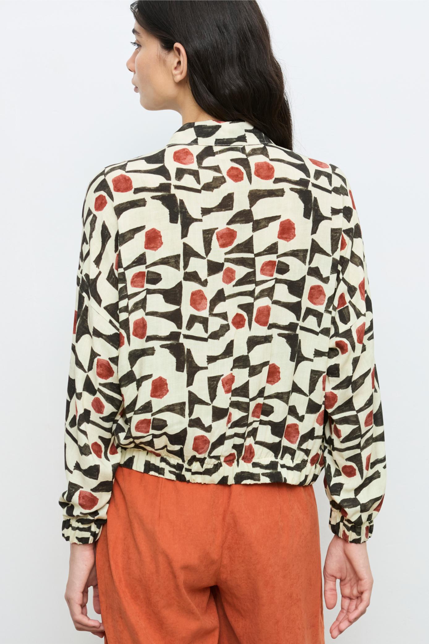 Coupe lègèrement oversize – forme blousante – élastiqué bas des manches et bas – 2 poches – col – boutonné devant