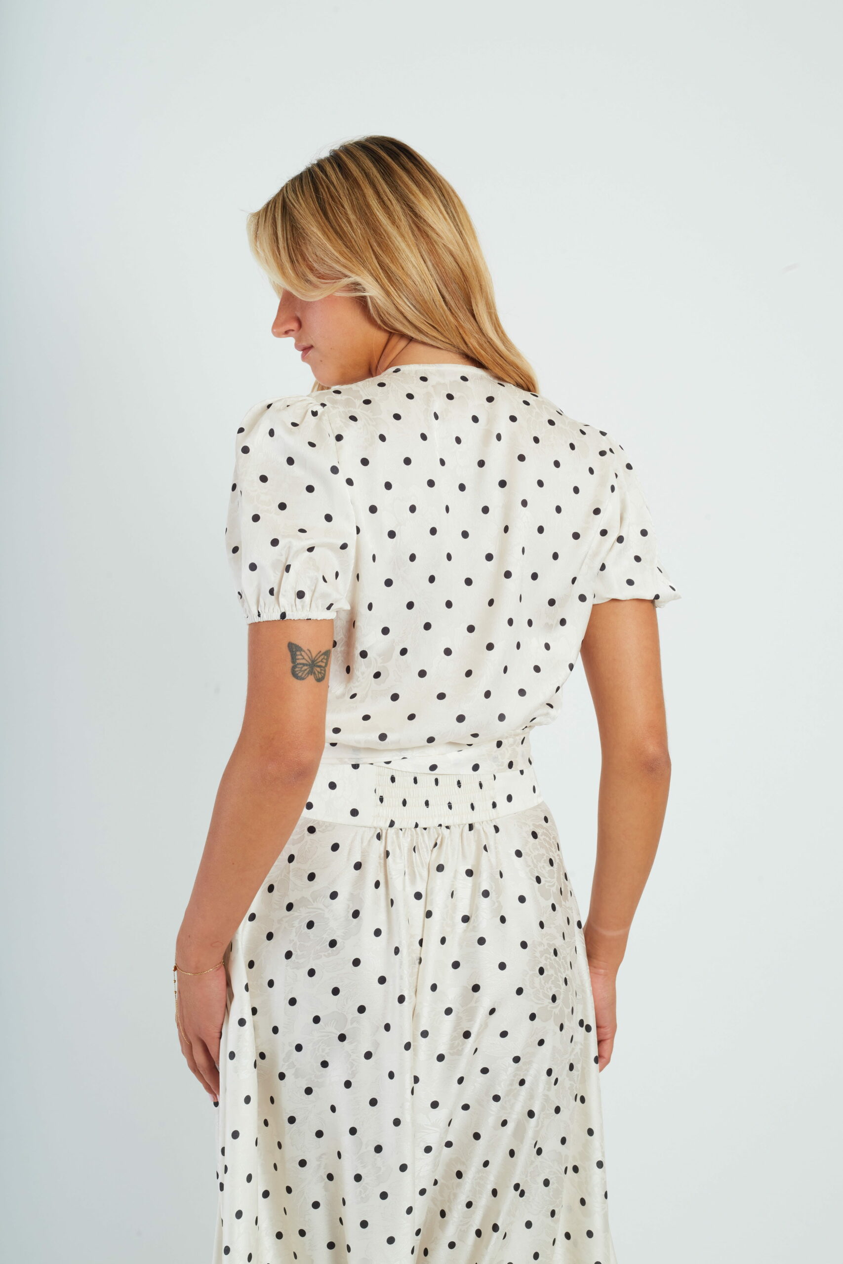 Coupe courte – ajustée – manches ballons – élastiquée bas des manches et bas dos pour donner un côté blousant – se ferme en se nouant – tissu fluide