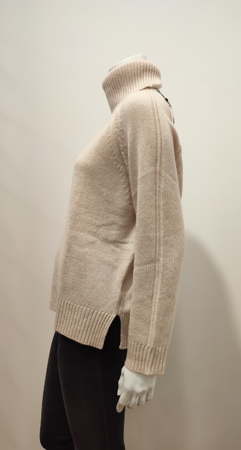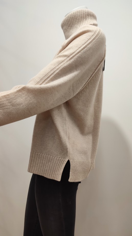 Coupe oversize – manches raglantes – col roulé fendu derrière – bandes devant et derrière – fendu sur les côtés