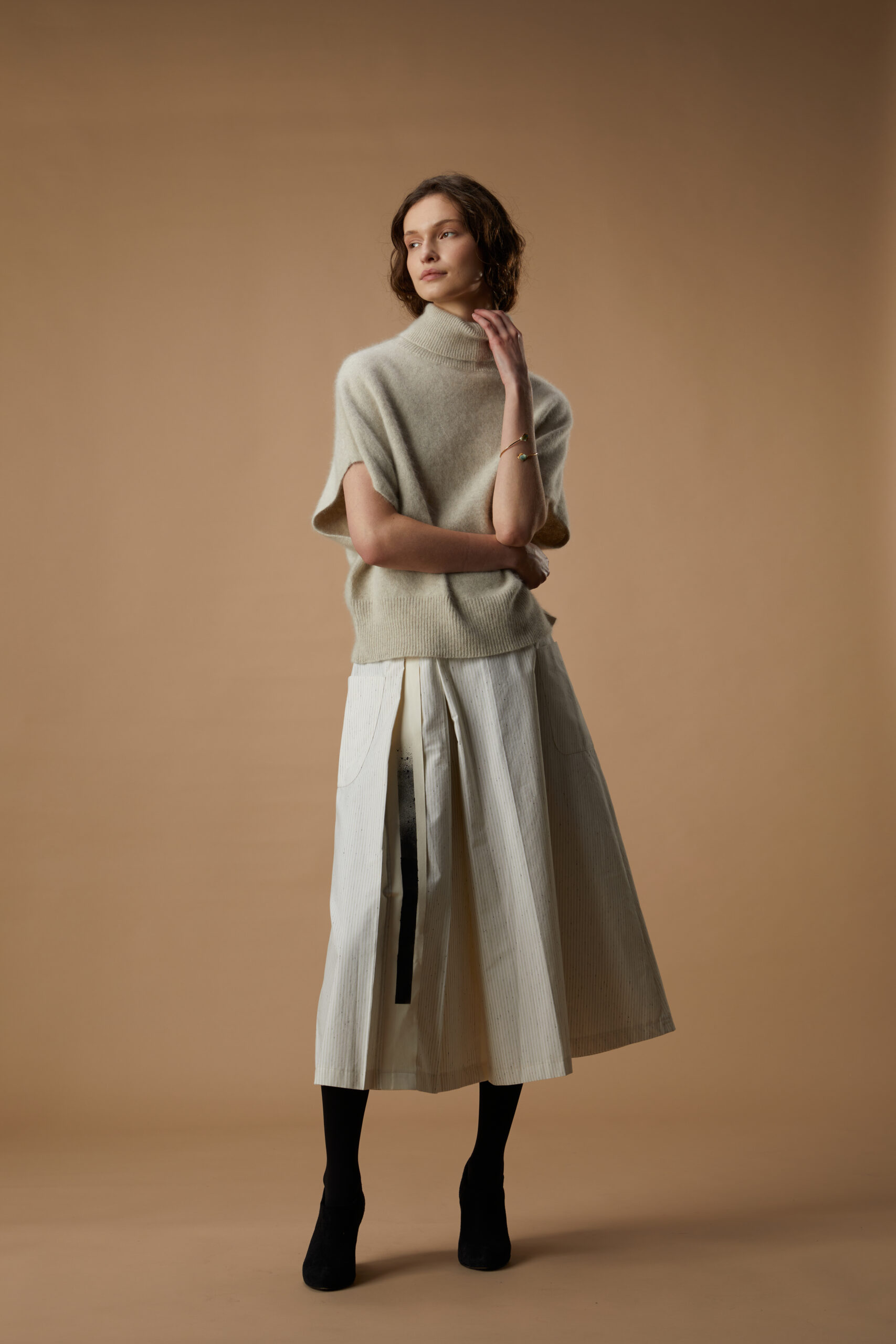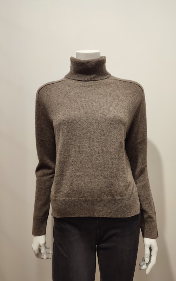 Pull long – coupe oversize – manches montées bas – fendu sur les côtés – grands bords côtes en bas ainsi que sur le col et les manches – col roulé fendu derrière