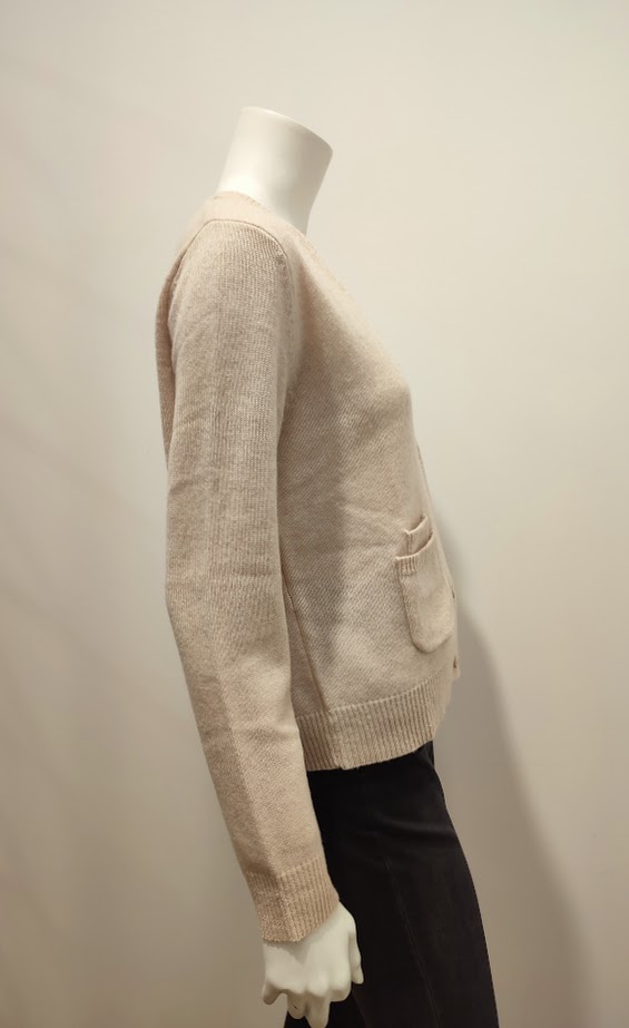 Coupe plutôt courte – droite – manches montées – poches devant – boutonné devant – col V