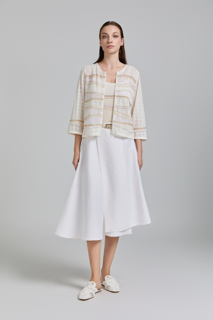 Gilet ample – manches 3/4 et larges – col V – dos uni écru – boutonné devant