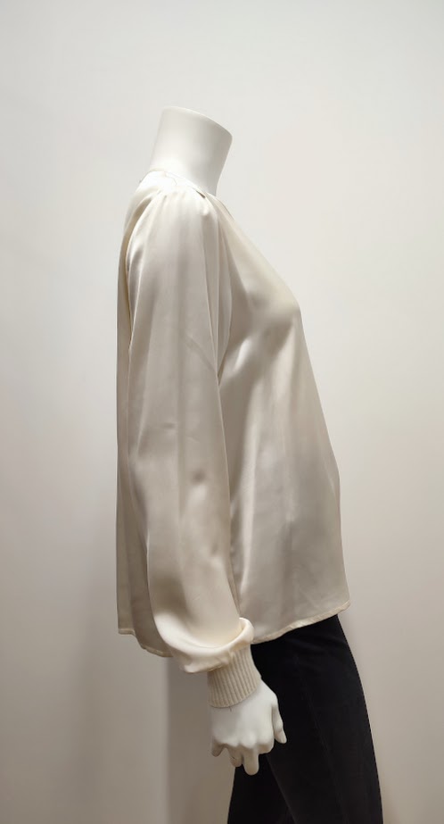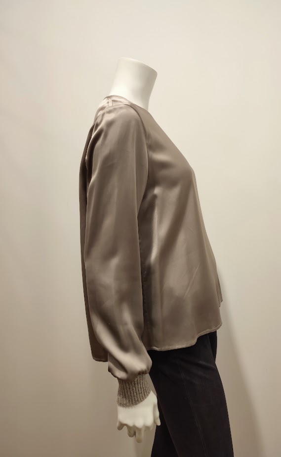 Tissu fluide – col rond – coupe droite – manches finition bord côte en laine et soie – petit bouton avec échancrure en goutte d’eau à l’arrière du col ; pour l’enfiler plus facilement
