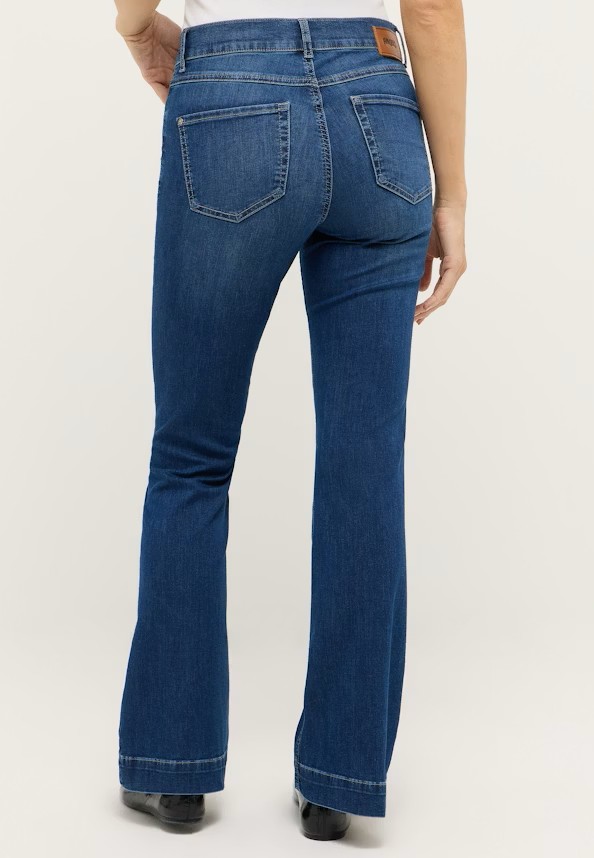Taille normale – coupe ajustée puis s’évase dans le bas après le genou – poches « smart » devant – finition large de la surpiqûre en bas de l’ourlet
