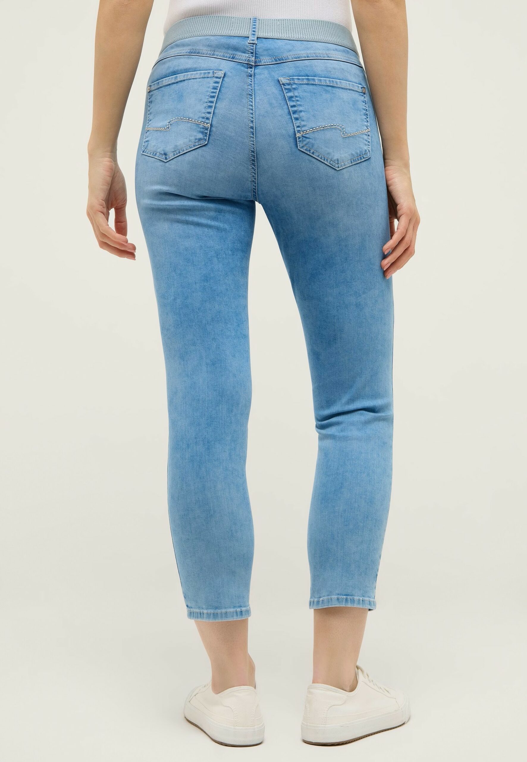 Taille haute – bande élastique qui fait le tour de la taille sauf devant , au niveau du bouton – 2 poches devant – 2 poches derrière – coupe près du corps – longueur 6/8ème