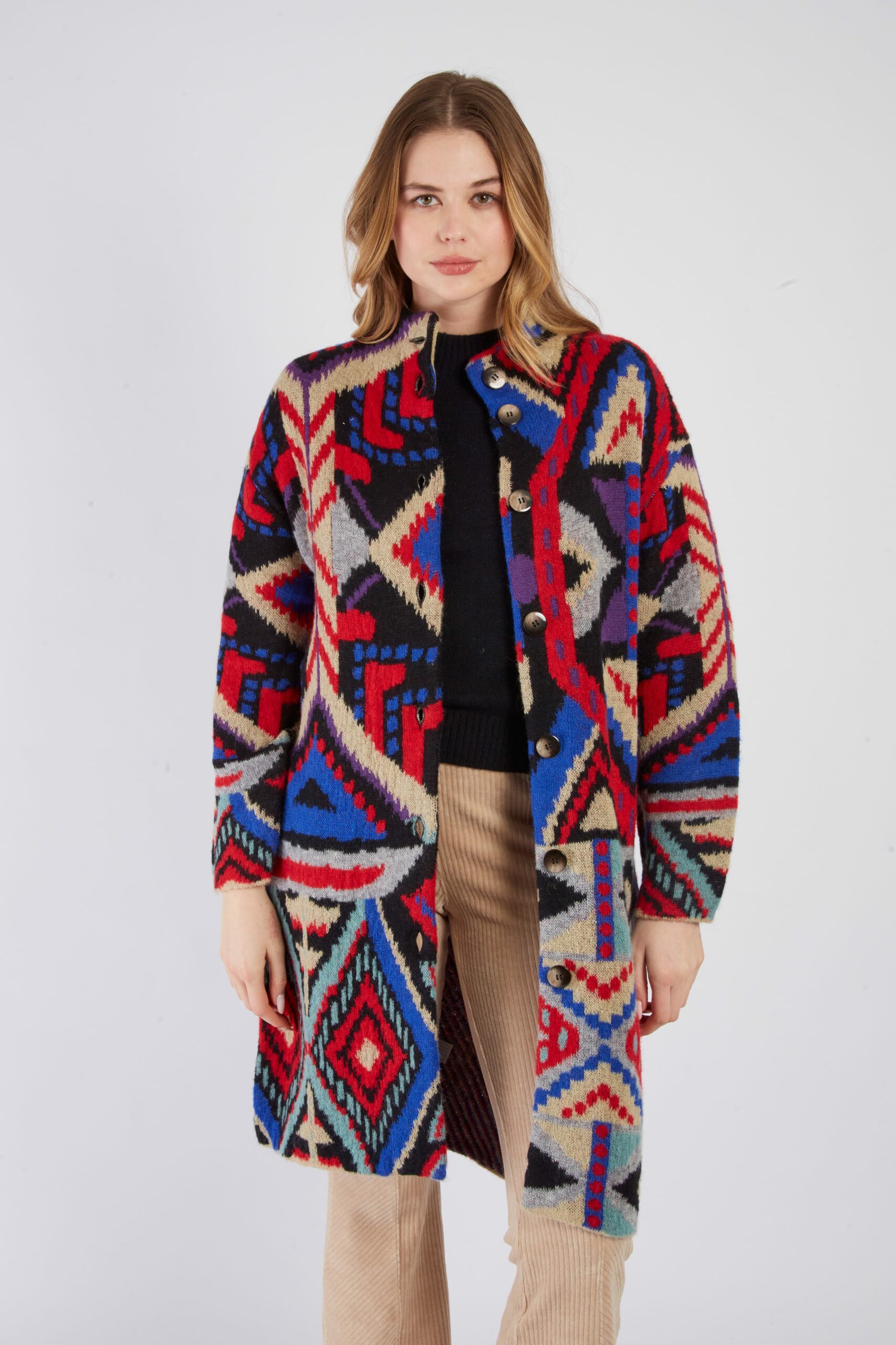 Manteau mi-long , en maille – coupe oversize droite – col montant – boutonné devant – 2 poches