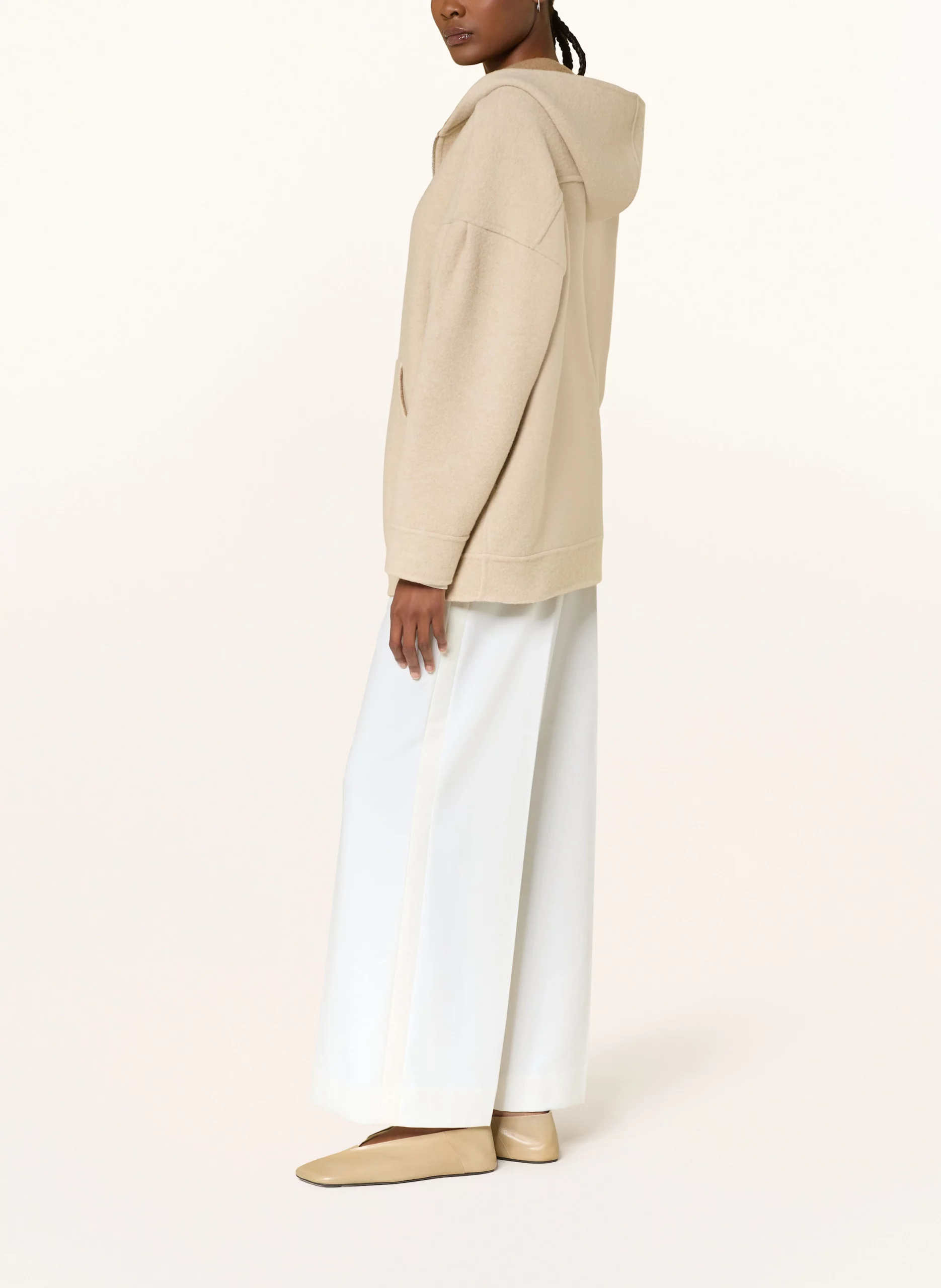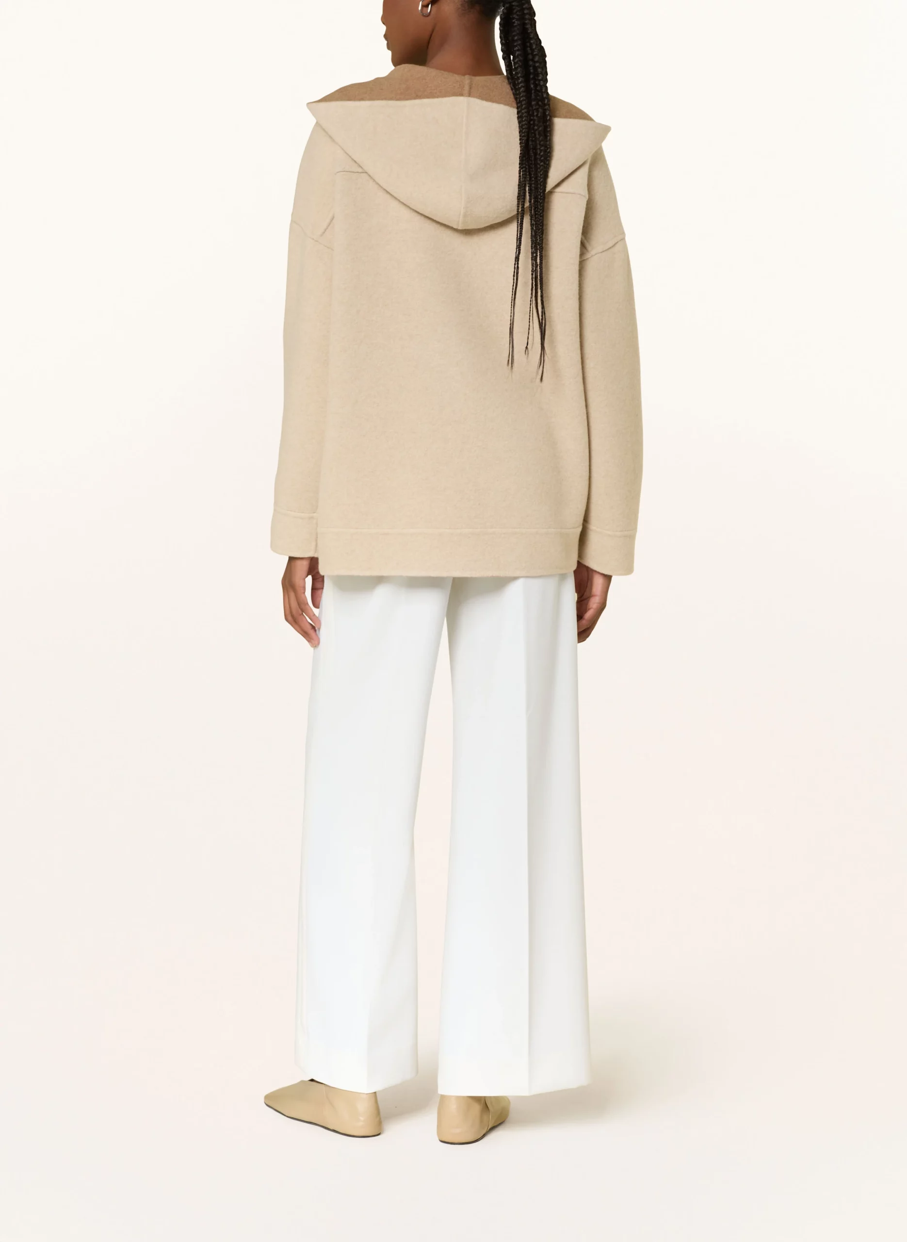 Coupe droite un peu oversize – mi-long – capuche non amovible – 2 grandes poches – fermeture éclair apparente devant – tissu double face – manches montées basses – pinces sur les manches