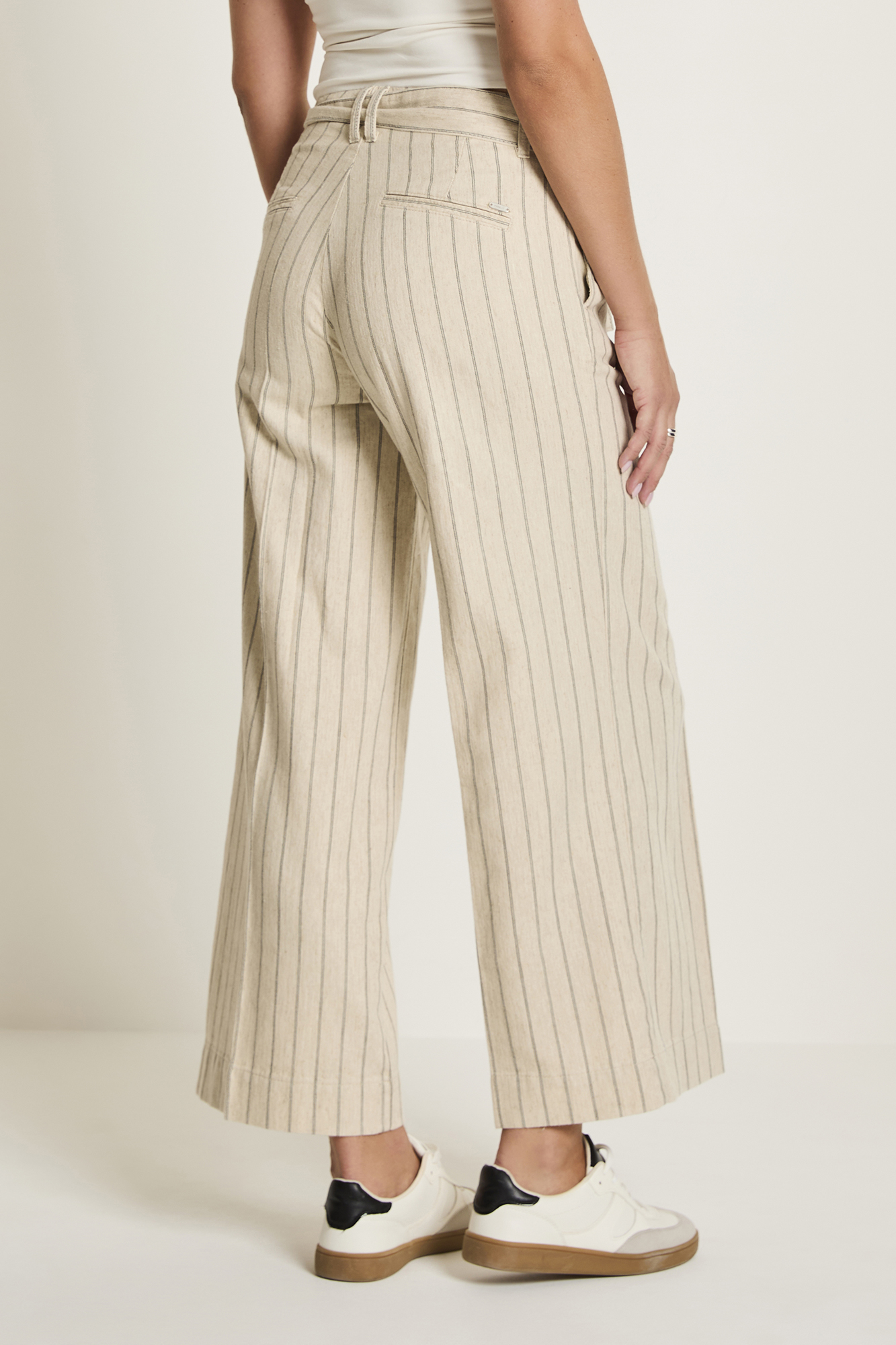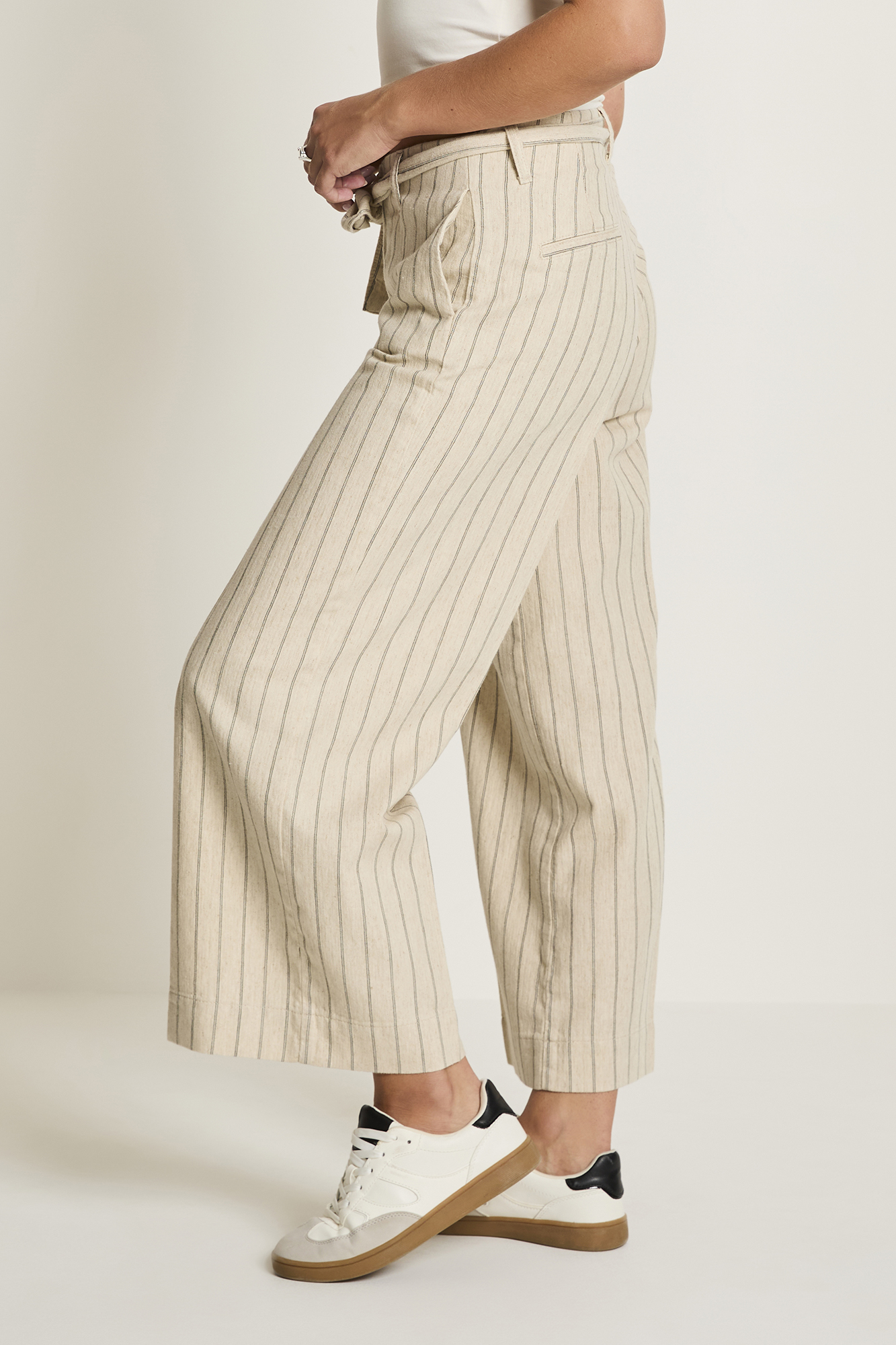 Taille haute – jambe large – longueur 7/8ème – élastiqué à l’arrière – ceinture à nouer – 2 poches fendues