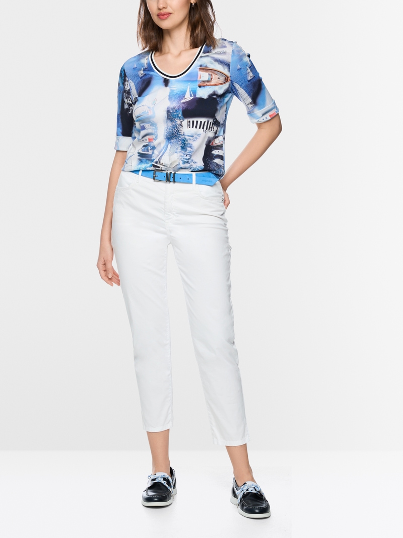 Taille haute ( hauteur 28 cm) – coupe décontractée au niveau des cuisses – fuselé vers le bas – 2 petites fentes au bas des jambes – 4 poches – en tissu de coton estival, léger