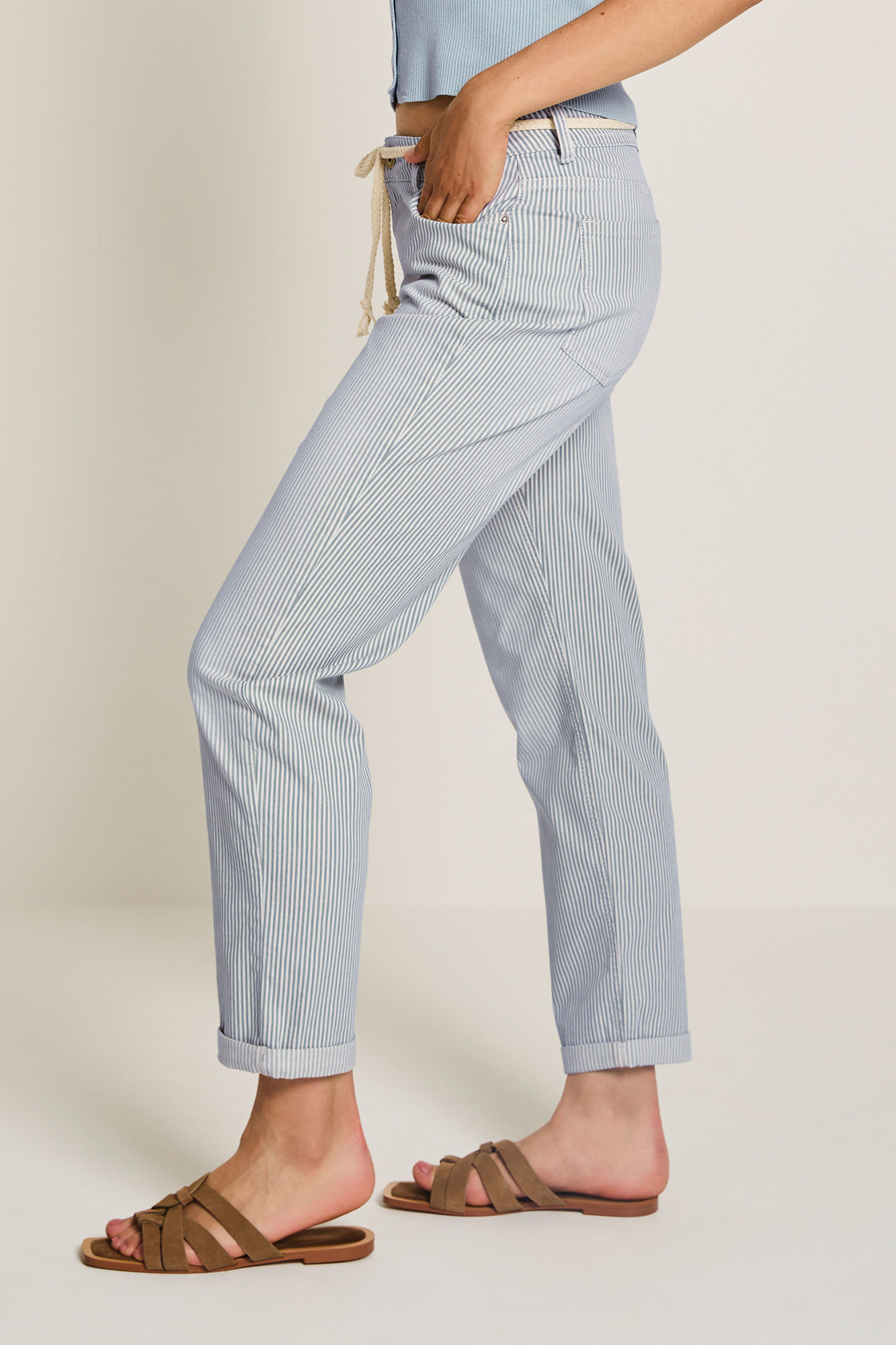 Taille haute – coupe loose – vendu avec sa ceinture en cordelette – finition avec ou sans revers