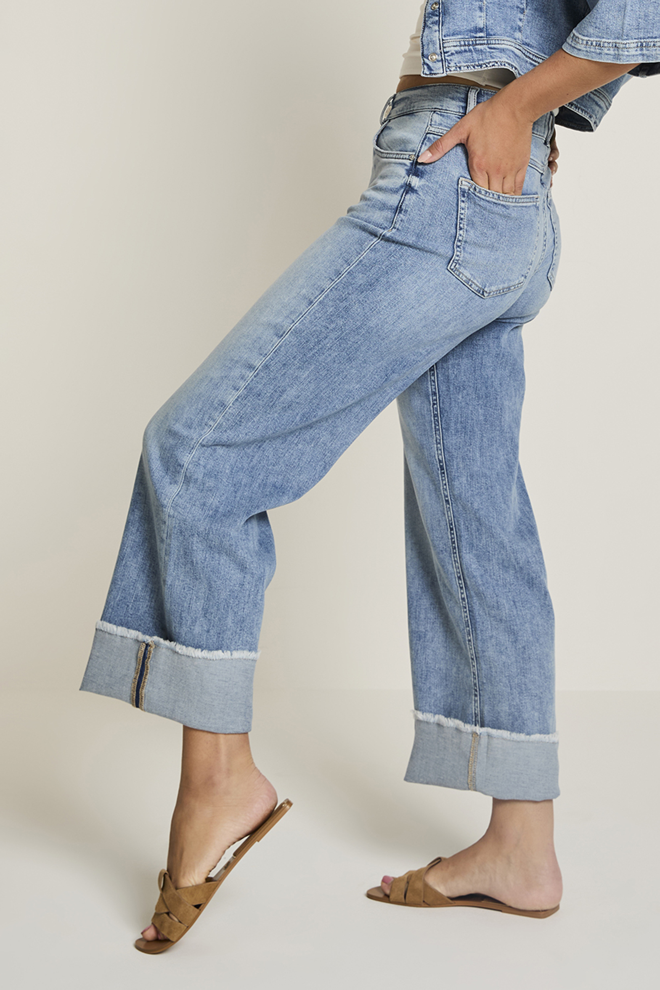 Coupe taille très haute – jambe droite large = « wide leg » – longuer 6/8ème = longueur 28 – grand revers cousu finition frangé dans le bas