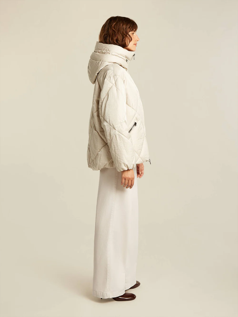 Doudoune coupe oversize – matellassage motif grands losanges – capuche non amovible avec cordon de serrage – un peu plus longue derrière – manchons en bas des manches – élastiquée en bas à l’arrière et peut se reserrer à l’aide d’un cordon élastique – 2 poches extérieures zippées – 1 poche intérieure zippée – tissu qui reflète la lumière –