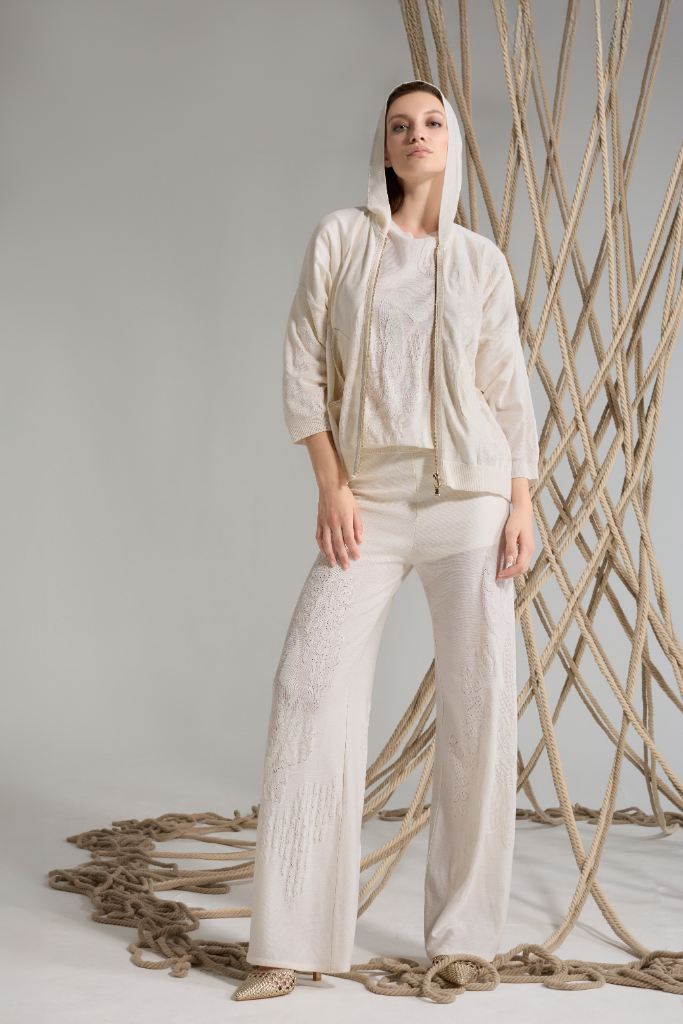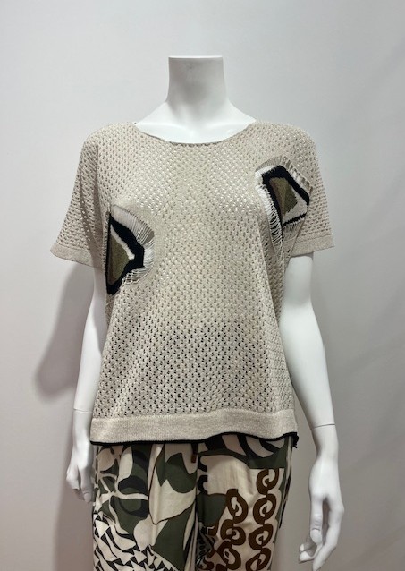 T-shirt en maille avec de légers details dorés et touches de kaki, marron et écru.