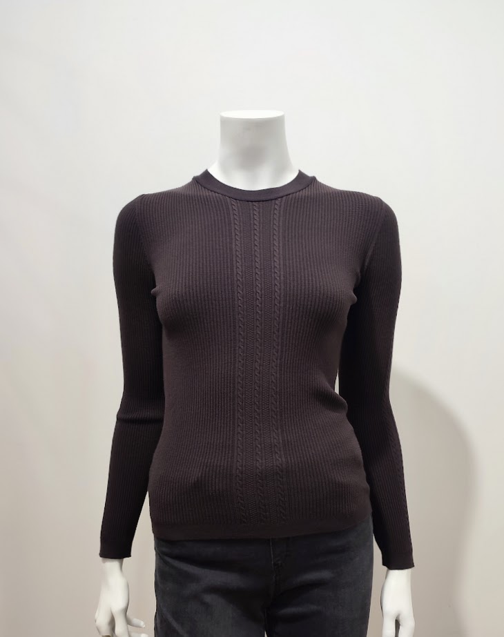 Coupe près du corps – col rond – manches longues – maille côtelée avec dessin torsadé devant et sur l’extérieur des manches
