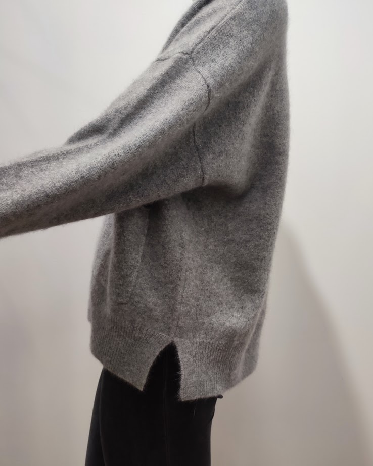 Coupe oversize – col V – manches montées basses – 1 poche – petites fentes sur les côtés