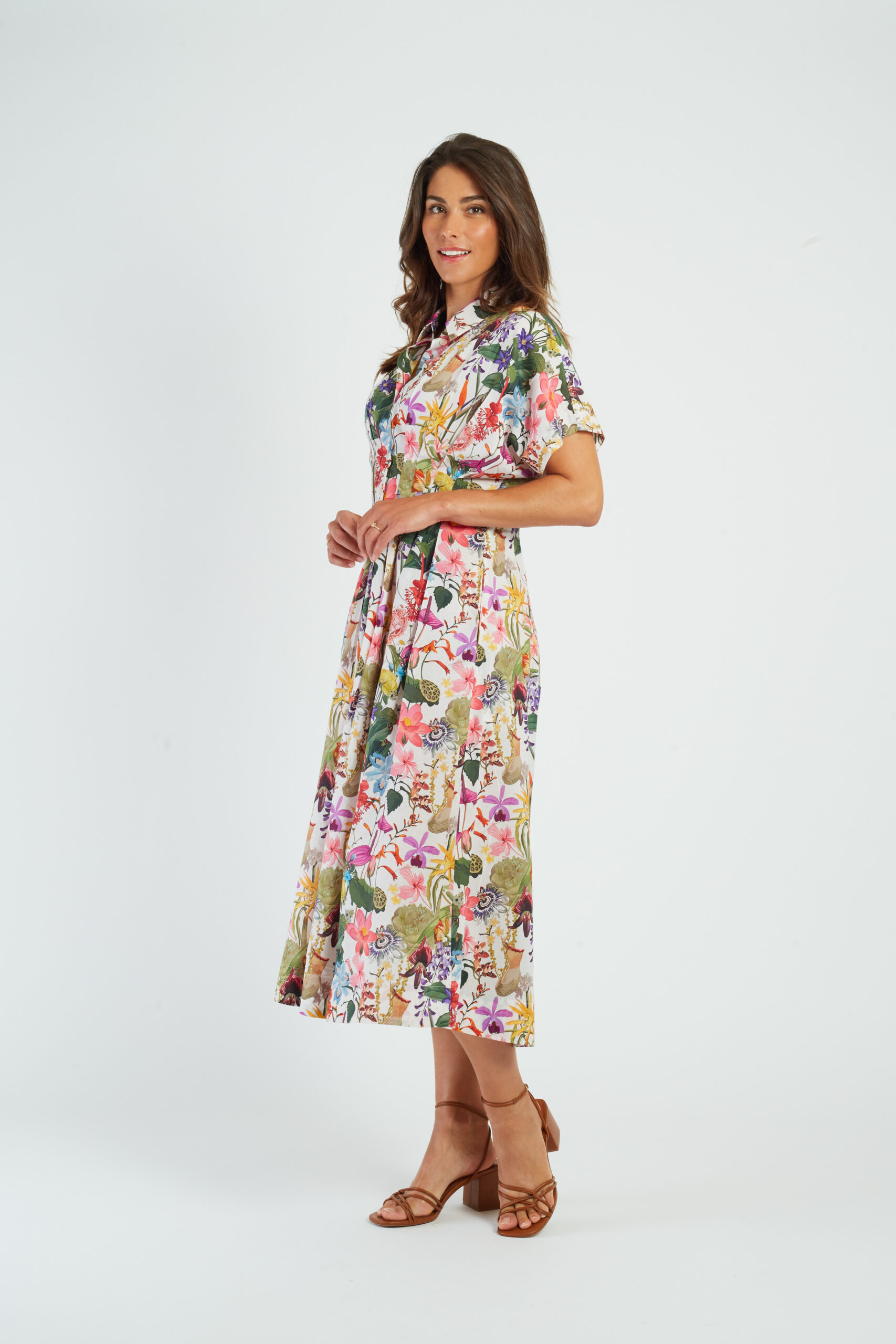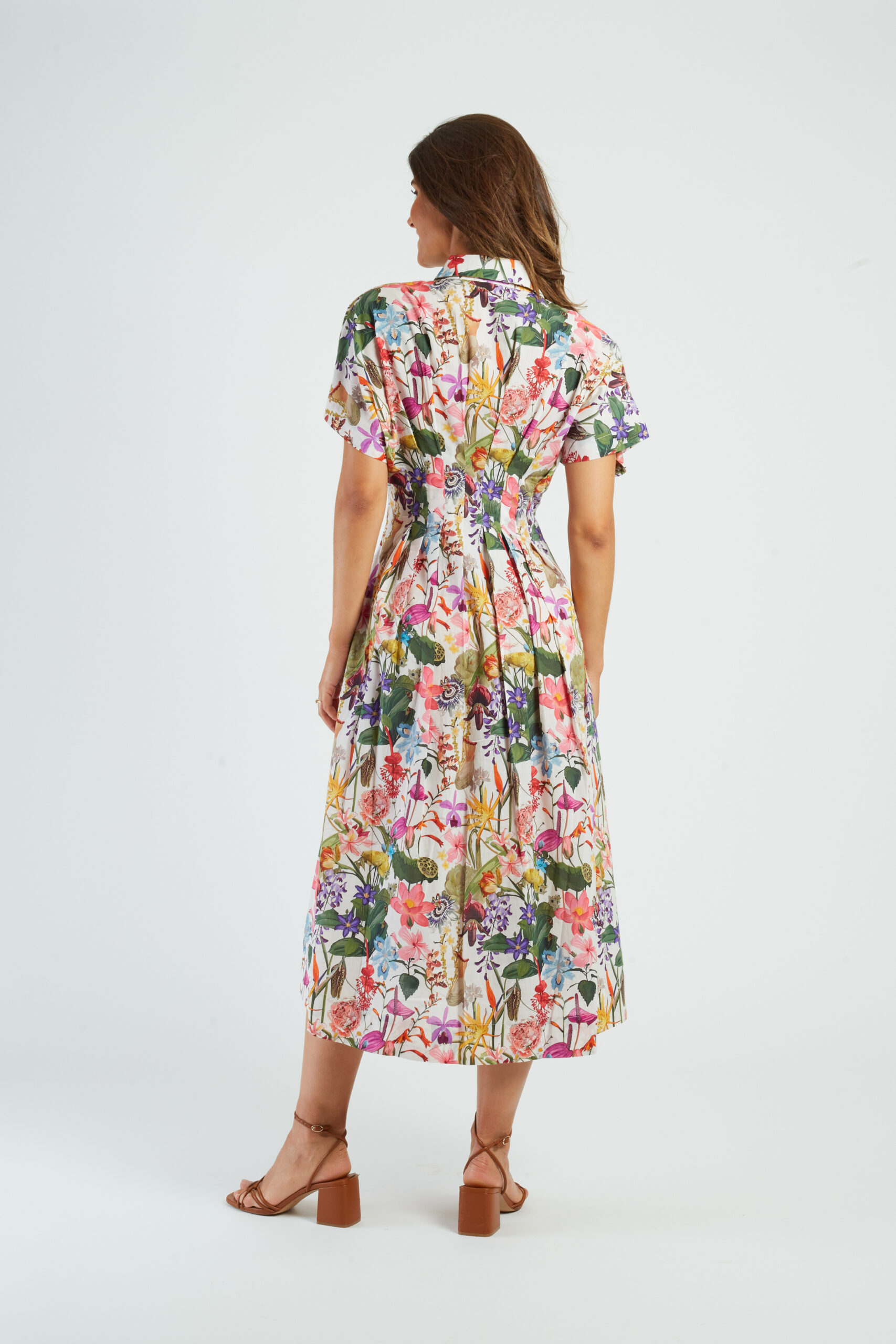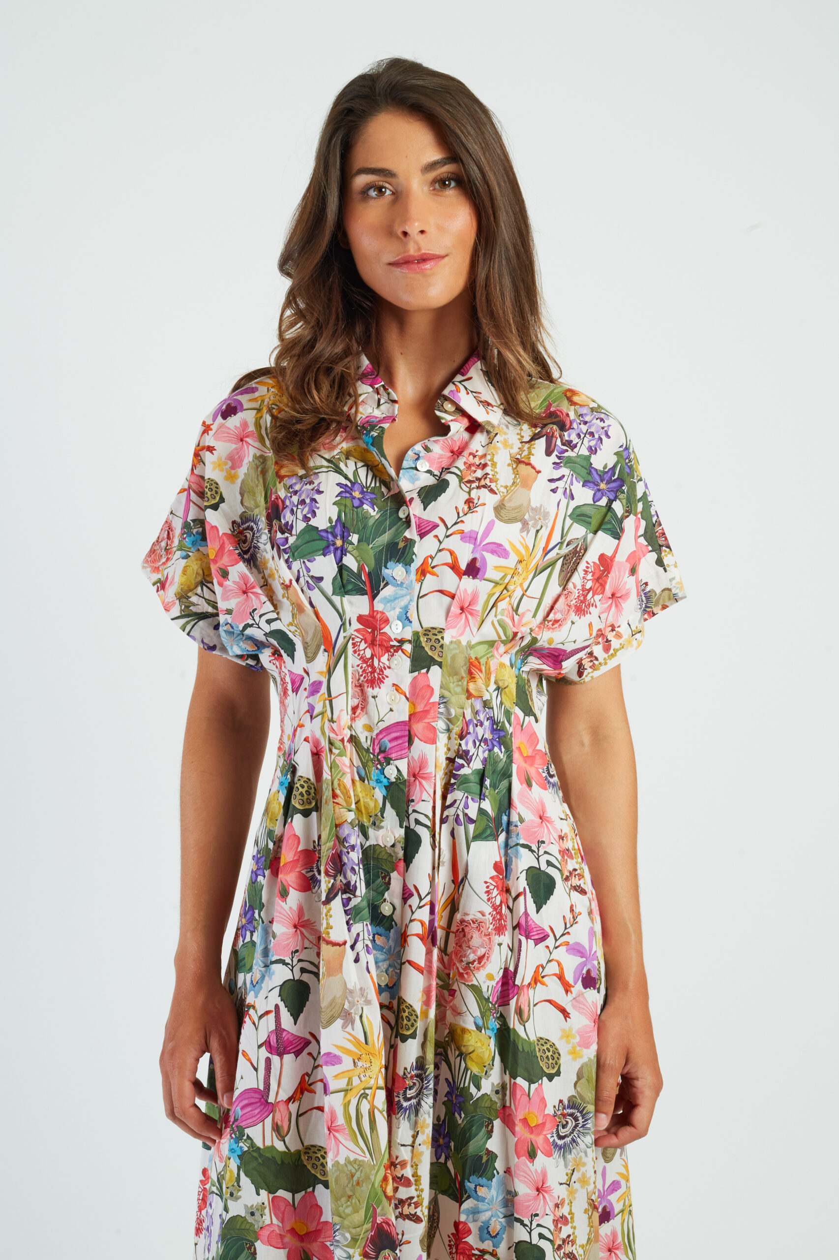 Coupe cintrée à la taille puis trapèze vers le bas – longueur cheville – col – boutonnée devant – tissu fluide et léger – manches courtes – 2 poches – des pinces au niveau de la taille